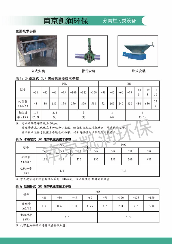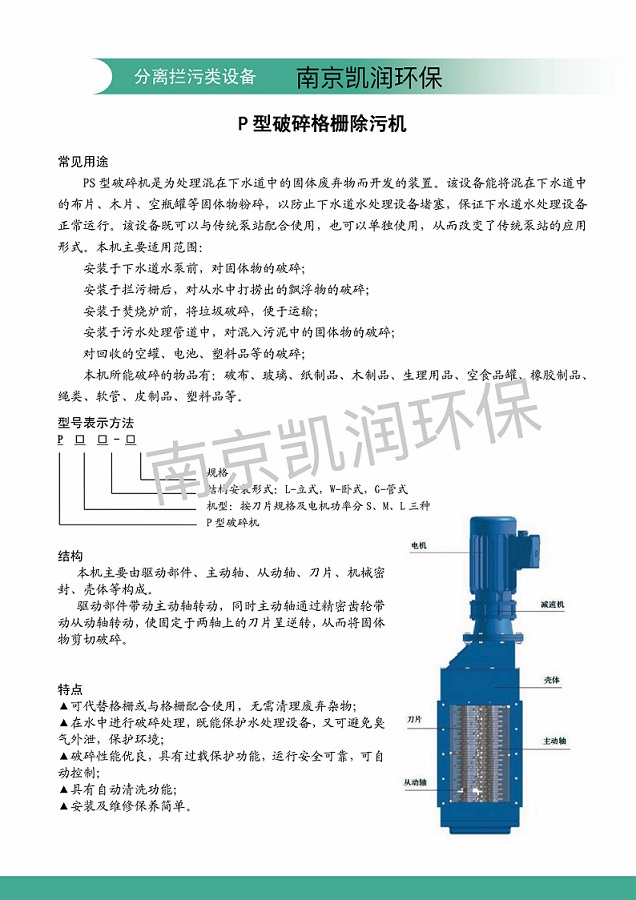 P型破碎格栅是为处理混在下水道中的固体物质而开发的新型污水处理设备。该机能将混在下水道中的布片、木片、空瓶罐等固体由格栅截留送到破碎机中粉碎,而水以格栅中流过,以防止下水道水处理设备的堵塞,保证下水道水处理设备正常运行。本机主要适用于污水理厂和中转京站。适用环境现在不常用的泵站为半地下式,采用普通机械格棚和污水泵,由于机械格栅清渣的需要,格棚一般露于地上,因而需修建地上建筑,而旦格栅栅渣会带来臭味、苍蝇等环境问题,还要定期将栅渣外运,这大大增加了人力、物力,财力。新型全地埋式泵站,该种泵站建于地下,顶部全封闭,臭气不外溢;泵站采用粉碎型格栅,改变了传统的栅渣打捞外运方式,污水中的栅渣随污水带走,能实现真正意义上的无人值守型泵站。粉碎型格棚是为处理混在下水道中的国体物质而开发的新型污水处理设备。该机能将混在下水道中的布片、木片空瓶罐等固体物由格栅截留送到破碎机中粉碎,以防止大块物质聚积成田在下水道中,堵塞水处理设备,保证了下水道水处理设备正常的运行。该设备既可 以与传统泵站配合使用,也可以单独使用,主要适用于污水处理厂和中转泵站。本机所能破碎的物品有:破布、 玻璃、纸制品、木制品、生理用品、空罐、渣滓、橡胶制品、绳类、软管、皮制品、塑料品等。