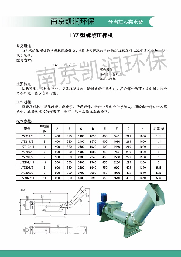 LYZ型螺旋压榨机是拦污格栅的配套设备,它是由进料斗、压榨螺旋、螺旋管、排渣管和驱动装置组成。格栅捞取的栅渣或过滤后滤渣从进料斗进入螺旋管,在压榨螺旋的作用下被挤压、脱水。从物料中被挤出的水透过滤网汇集到接水盆并由排水管排出,物料被压缩后经排渣管排出,从而可以大大地减少栅渣等杂物的重量和体积。螺旋压榨机由排水区、进料区、螺旋输送区、出料区组成。栅渣进入料区,通过螺旋压榨机在压实区进行压实后栅渣排出,废液从栅条中流入集水管。